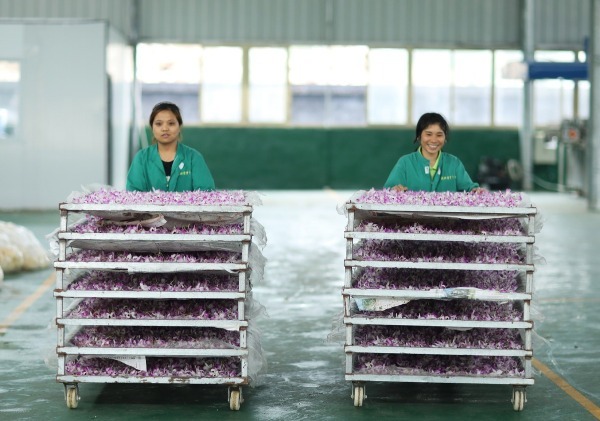 Farmers transport dendrobium flowers for bakery at Chishui, Southwest China's Guizhou province, on May 5. [Photo/Xinhua]