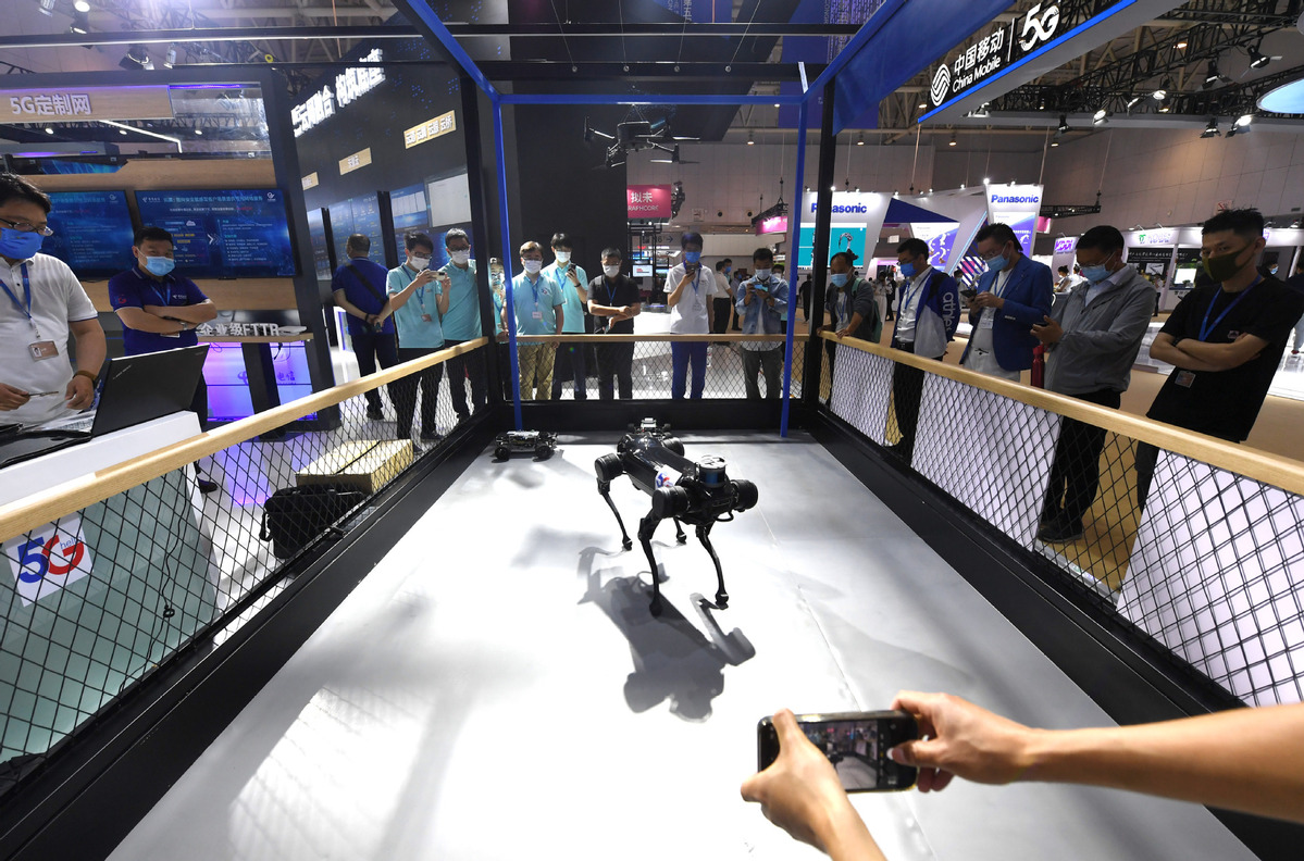 People view a quadruped robot at the World Intelligence Congress in Tianjin, north China, May 20, 2021. [Photo/Xinhua]