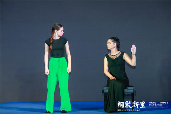 Milena Damjanovic, a Serbian soprano, performs with Matija, a dance teacher from the Republic of North Macedonia, to interpret a classical poem by ancient Chinese poet Jiang Kui on May 22, 2021. [Photo provided to chinadaily.com.cn]