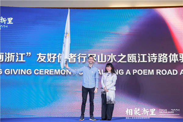 A flag is delivered at the ceremony to mark the start of an upcoming journey Admiring the Fascinating Scenery along the Oujiang River Poetry Road on May 22, 2021. [Photo provided to chinadaily.com.cn]