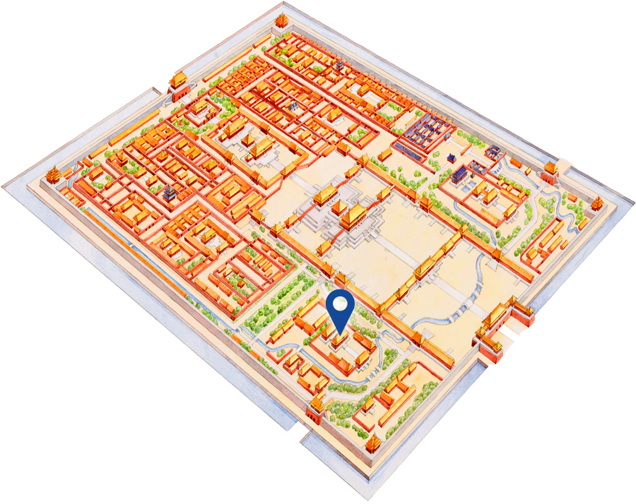 Close to the east side of the compound is a long passage way leading up to a western entrance to the Six Western Palaces (Xi liugong) - the living quarters of imperial wives and concubines. The southern section of the passage is bordered by groves of trees. In summer under the scorching sun you will find the shelter of cool shade here, while in the deep autumn the yellow ginkgo leaves against the neighboring red wall light up the grove - an ideal place for photographs. Halfway along the passage is a single-arch bridge spanning the Inner Golden River. It is said to be even older than the Forbidden City.