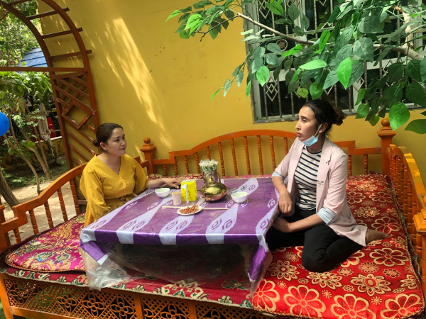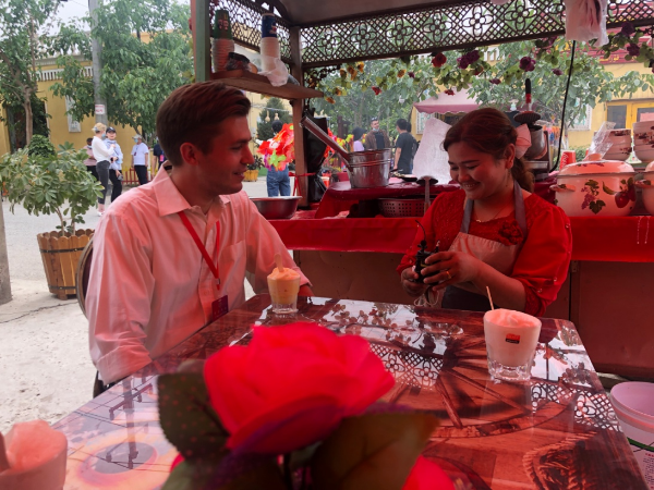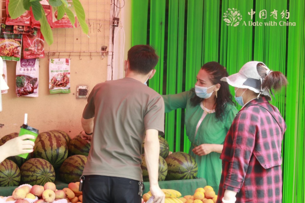A China Daily reporter talks to a woman who sells frozen yogurt and ice cream at the Street for Entrepreneurship and Employment in Shache county, Kashgar prefecture, Northwest China's Xinjiang Uygur autonomous region, on May 21, 2021. [Photo by Sun Ru/chinadaily.com.cn]
