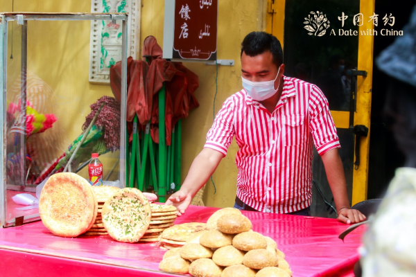 A man sells naan, a specialty Xinjiang food, at the Street for Entrepreneurship and Employment in Shache county, Kashgar prefecture, Northwest China's Xinjiang Uygur autonomous region, on May 21, 2021. [Photo/chinadaily.com.cn]