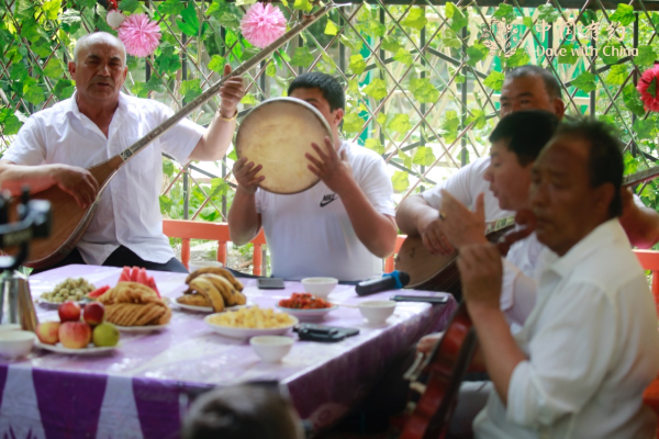 People play musical instruments at the Street for Entrepreneurship and Employment in Shache county, Kashgar prefecture, Northwest China's Xinjiang Uygur autonomous region, on May 21, 2021. [Photo/chinadaily.com.cn]