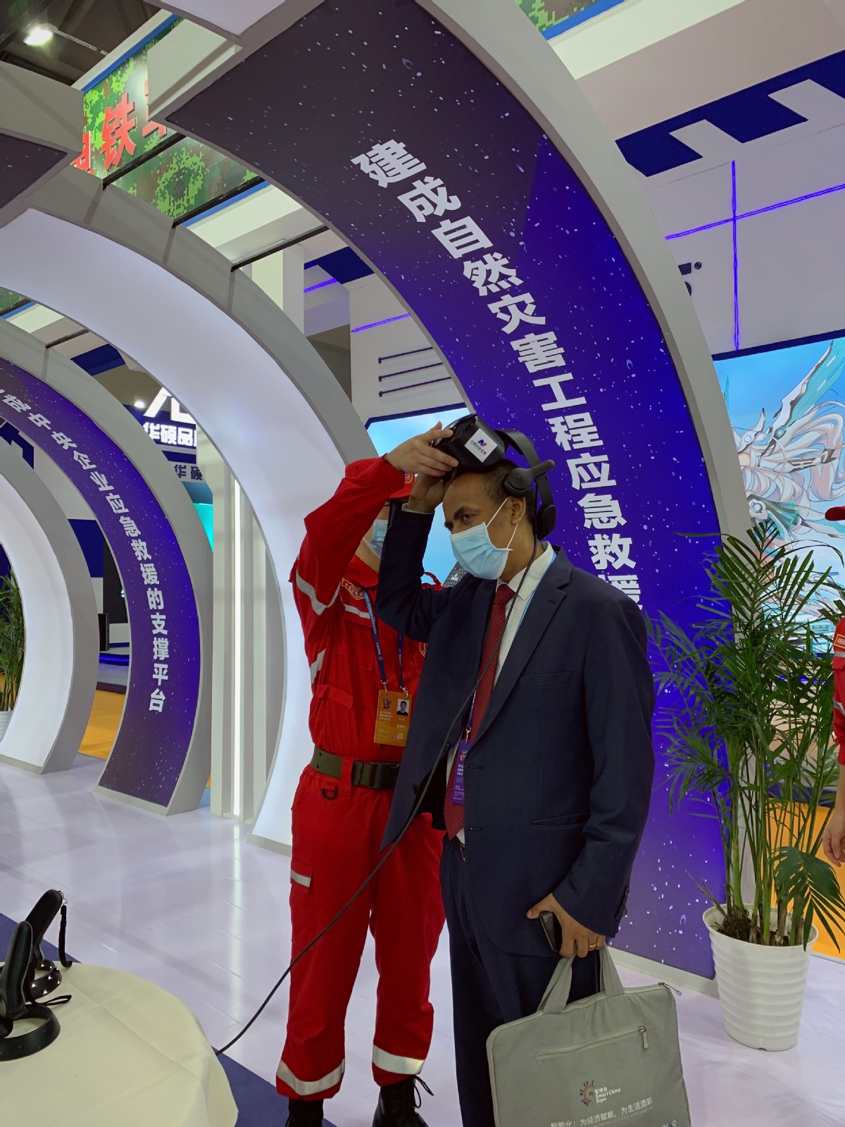 A foreign guest experiences emergency rescue virtual reality on Friday in the International Exhibition Hall during the Third Western China International Fair for Investment and Trade. [Photo by Deng Rui/For chinadaily.com.cn]