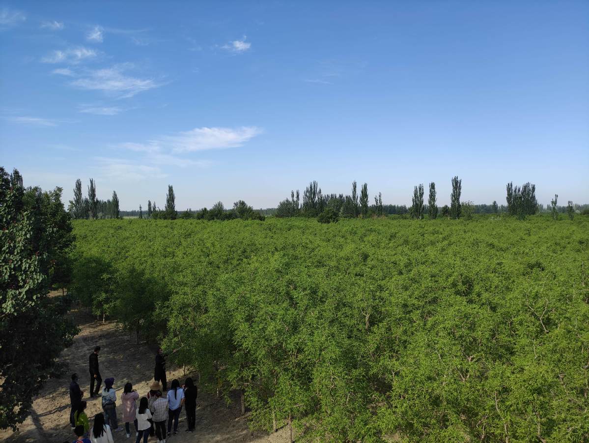 There is a wooden tower, about three stories high, at the entrance of the verdant grove, offering a sweeping view of the flourishing jujube plantation that, bisected by water canals and dotted with walnut trees, reaches as far as the lines of poplars standing sentry on the horizon. The scene, complete with occasional summer breezes and a sparkling blue sky, is bewitchingly evocative of lush river towns, until you step down from the tower and walk onto its powdery ground. Soft like a cushion, it's all sand.