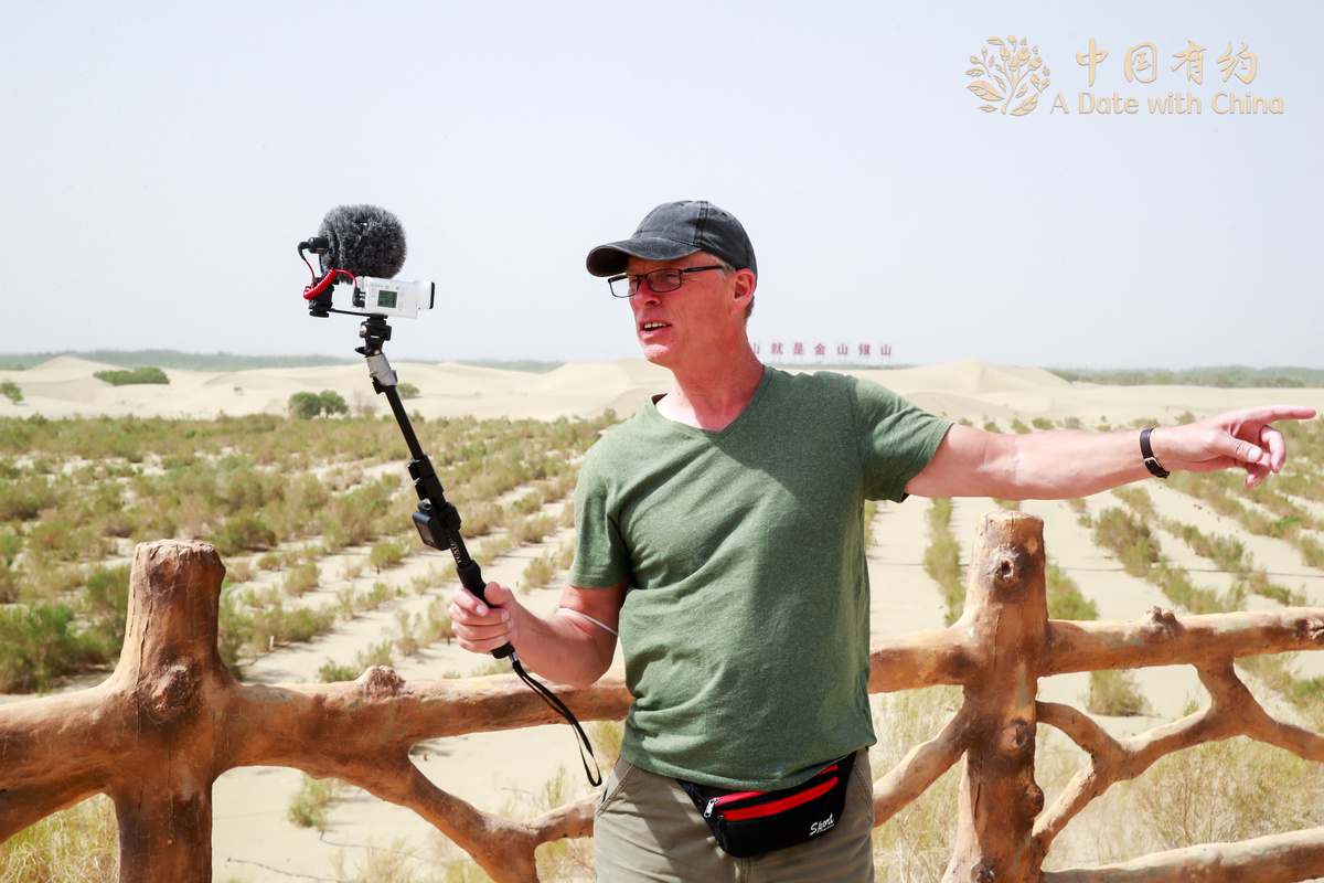A member of the "A Date with China" international media tour takes a selfie video at a site of ecological forestation in Makit county, Xinjiang Uygur autonomous region, on May 20, 2021. [Photo provided to chinadaily.com.cn]