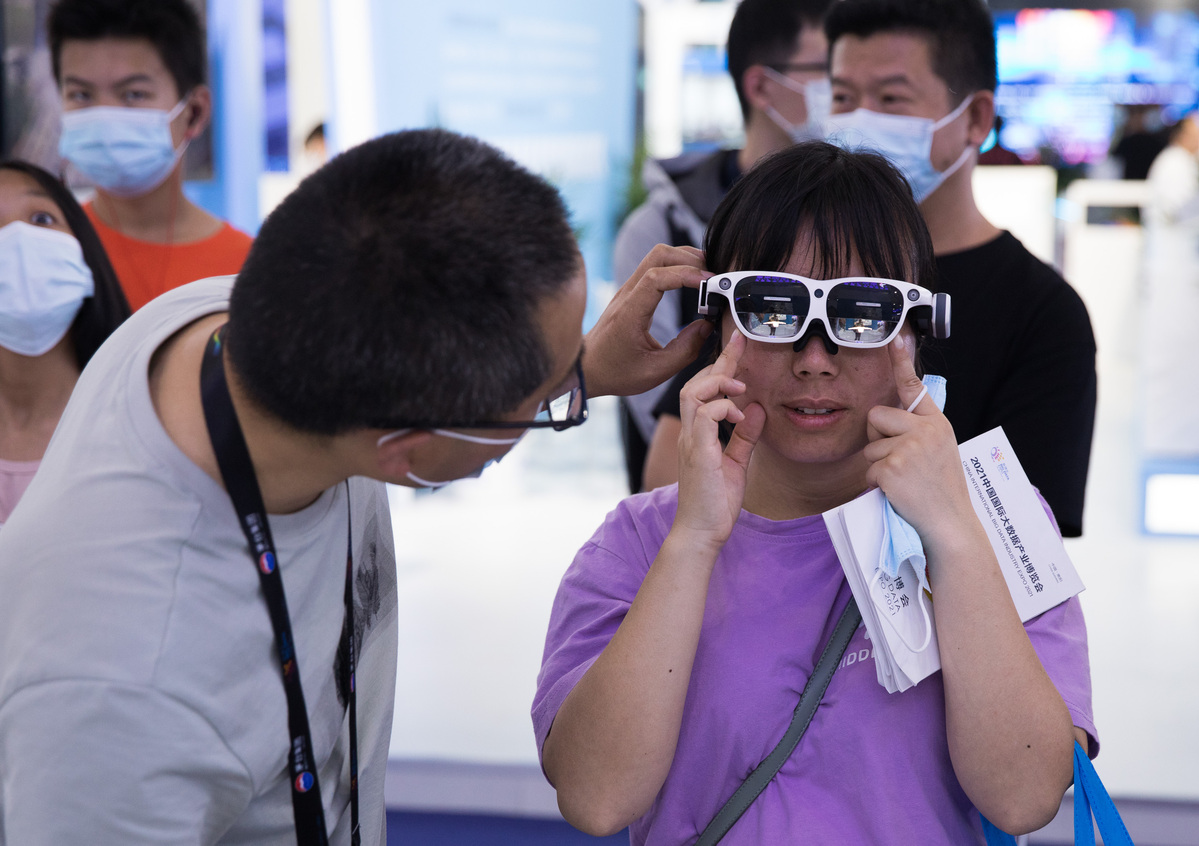 A visitor, right, experiences the mixed reality holographic classroom at the China International Big Data Expo in Guiyang, Southwest China's Guizhou province, on May 27, 2021. [Photo/Xinhua]