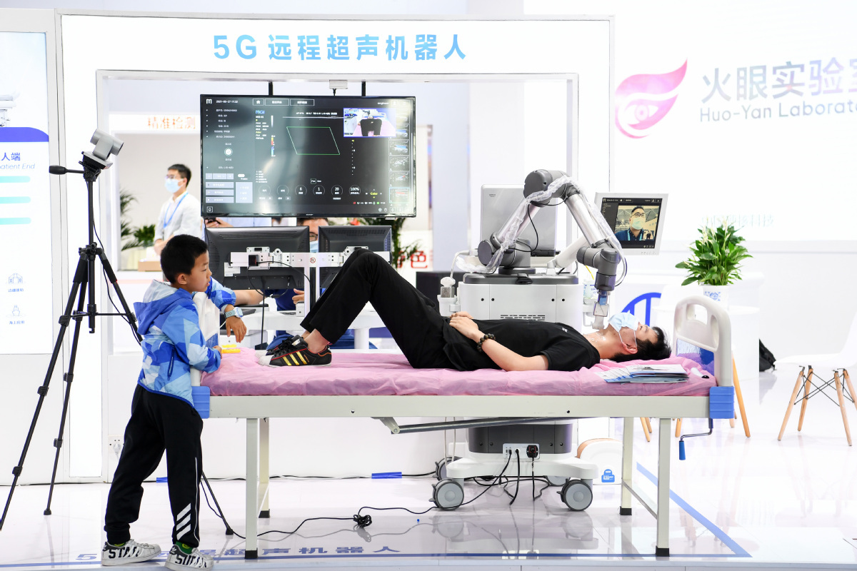 A 5G remote ultrasonic robot works at the China International Big Data Expo in Guiyang, Southwest China's Guizhou province, on May 27, 2021. [Photo/Xinhua]