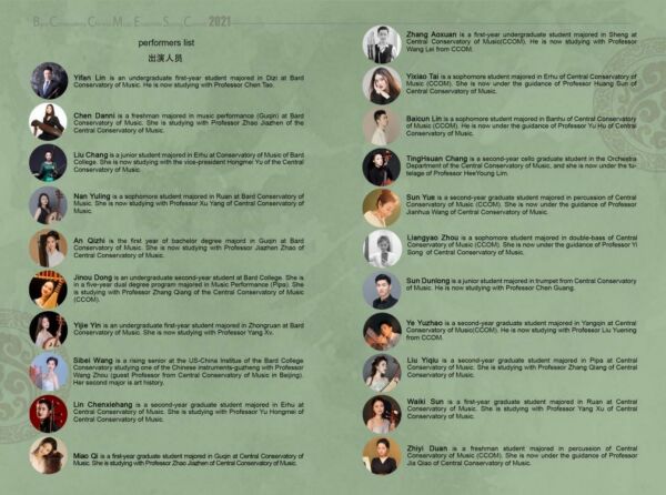 On May 21, 2021, under the guidance of Professor Chen Tao of the Bard College Conservatory of Music, eight Bard College students who majored in Chinese National Instrumental Music Performance cooperated with students from our Department of Folk Music to successfully hold a Folk Music Ensemble Concert, which showed the fruits of the students’ learning during the epidemic period.