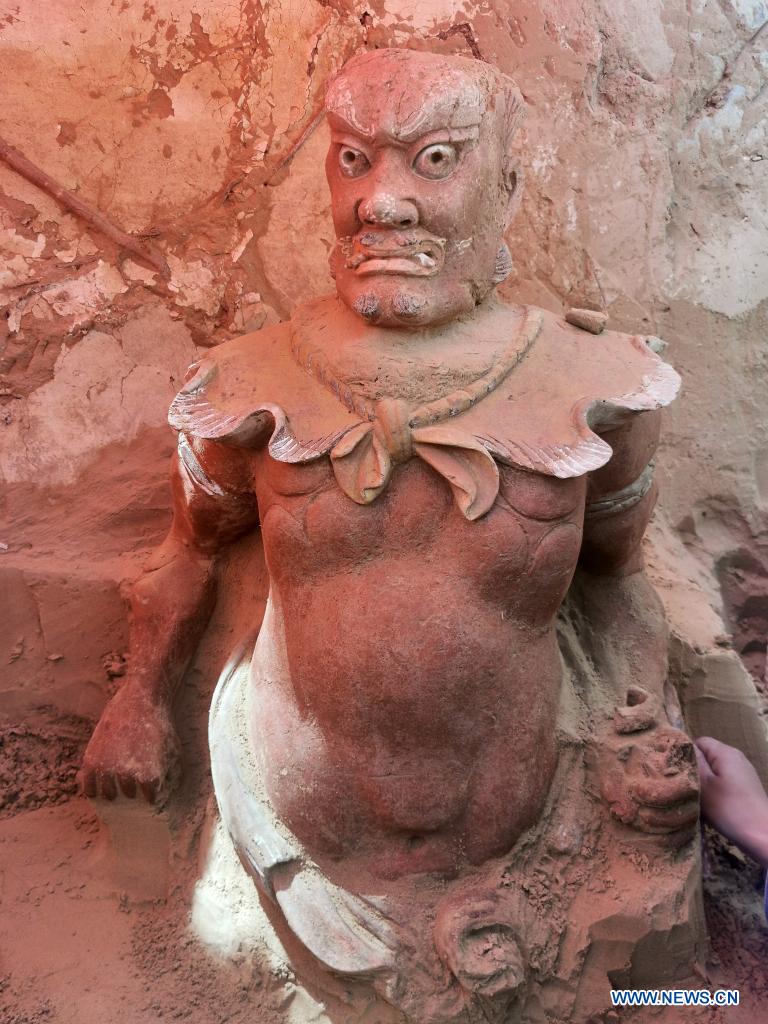 File photo taken on May 24, 2020 shows a clay statue unearthed from the remains of the Qingpingbao castle, located in Jingbian county, Yulin city of Northwest China's Shaanxi province. The remains of a Great Wall castle dating back to the Ming Dynasty (1368-1644) were discovered in Northwest China's Shaanxi province, said the Shaanxi Academy of Archaeology Tuesday. Architectural relics, including two courtyards, were found at the remains of the Qingpingbao castle.[Photo/Xinhua]