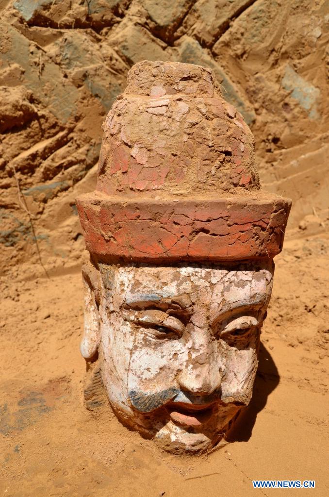 File photo taken on May 18, 2020 shows a clay statue unearthed from the remains of the Qingpingbao castle, located in Jingbian county, Yulin city of Northwest China's Shaanxi province. The remains of a Great Wall castle dating back to the Ming Dynasty (1368-1644) were discovered in Northwest China's Shaanxi province, said the Shaanxi Academy of Archaeology Tuesday. Architectural relics, including two courtyards, were found at the remains of the Qingpingbao castle.[Photo/Xinhua]