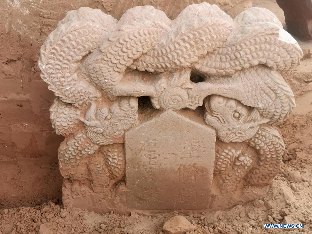 File photo taken on June 5, 2020 shows a stone tablet unearthed from the remains of the Qingpingbao castle, located in Jingbian county, Yulin city of northwest China's Shaanxi province. The remains of a Great Wall castle dating back to the Ming Dynasty (1368-1644) were discovered in Northwest China's Shaanxi province, said the Shaanxi Academy of Archaeology Tuesday. Architectural relics, including two courtyards, were found at the remains of the Qingpingbao castle.[Photo/Xinhua]