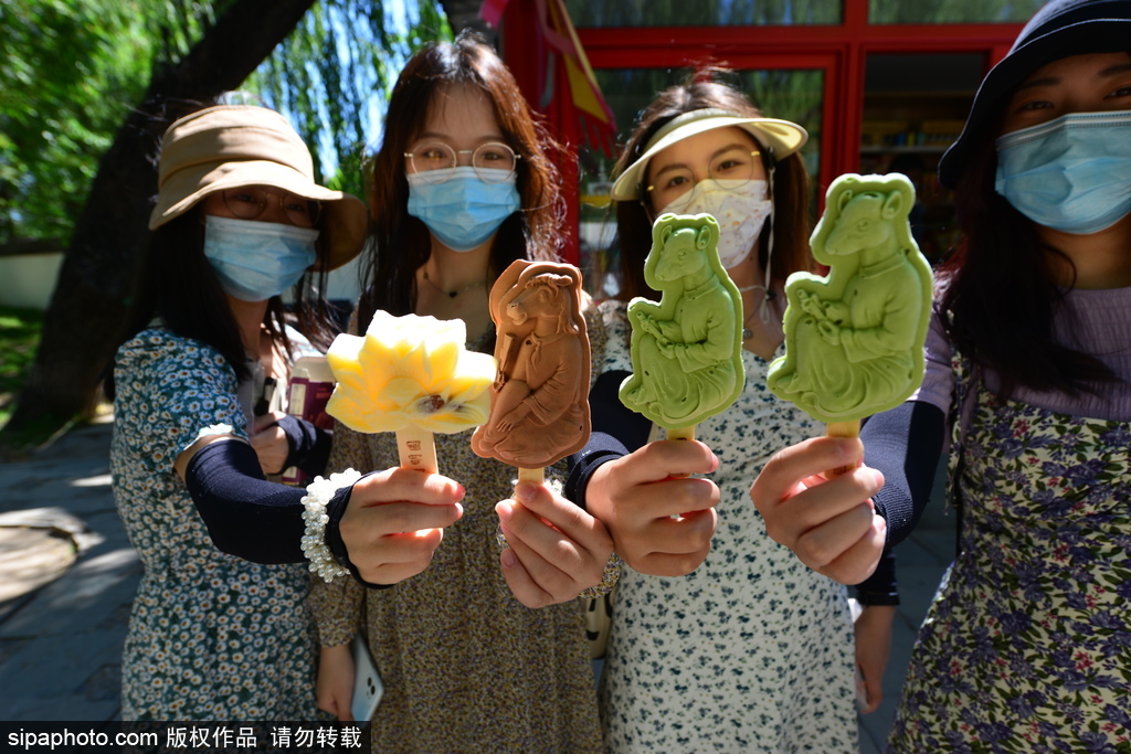Tourists show the ice cream pops in shape of the lotus and auspicious animals in the Old Summer Palace in Beijing, on June 3, 2021. [Photo/Sipa]