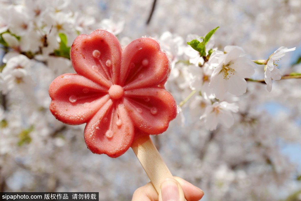 A cherry blossom-shaped ice pop in Yuyuantan Park in Beijing, on April 5, 2021. [Photo/Sipa]