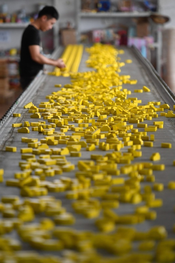A worker collects toy parts in a factory in Yunhe county, Zhejiang province, on June 4, 2021. [Photo/Xinhua]
