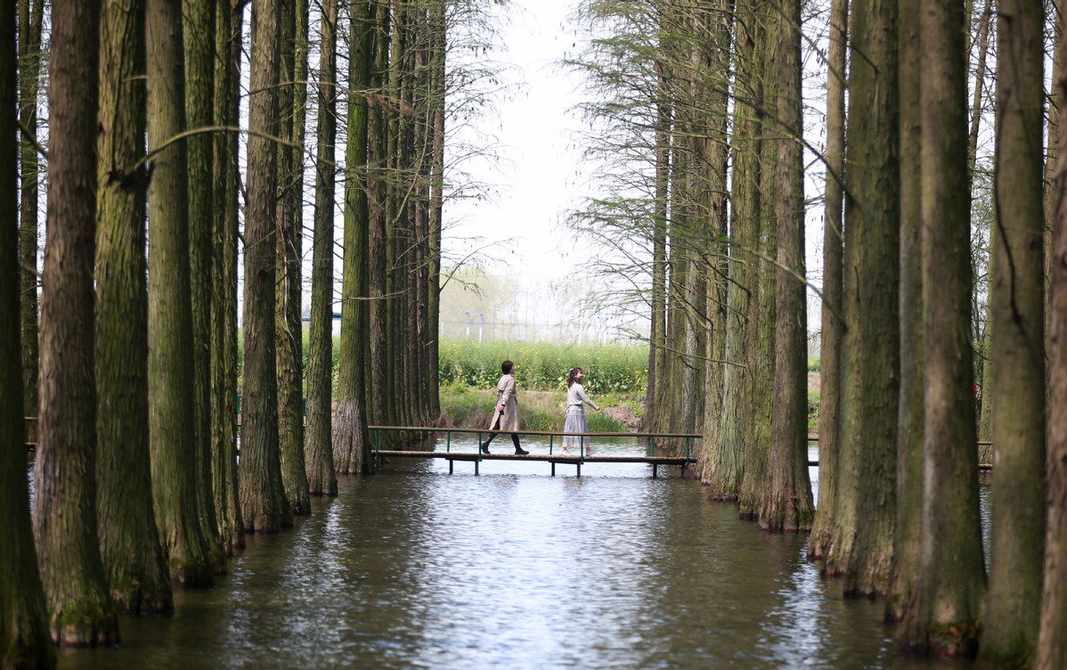 Tourists walk on the wooden bridge in the Luyanghu Wetland Park in Yangzhou, Jiangsu province, on April 5, 2021. [Photo/Sipa]
