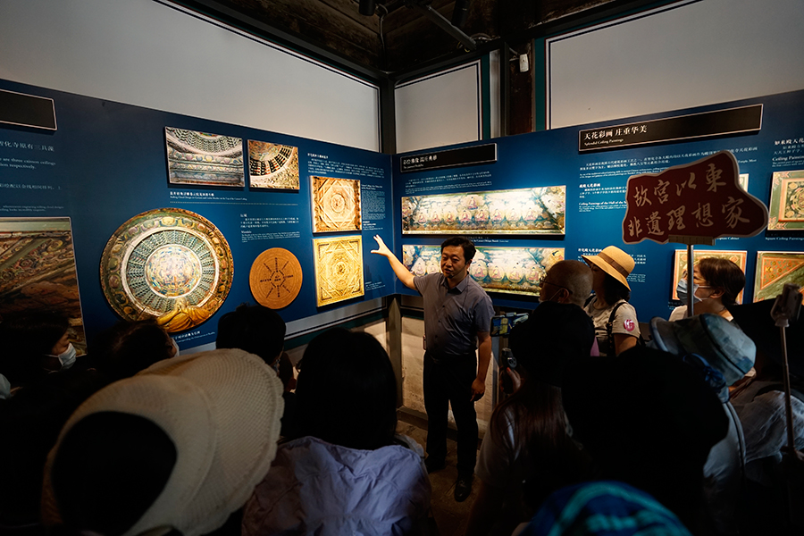 Yang Zhiguo, deputy curator of the Beijing Museum for the Exchange of Cultural Relics, gave the audience an extensive tour of the heritage site and provided a detailed explanation of the architectural structure, ceiling patterns, historical artifacts and cultural background of Zhihua Temple, June 12, 2021.[Photo provided to chinadaily.com.cn]