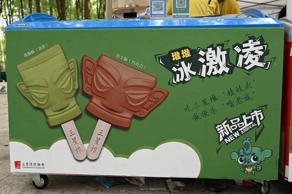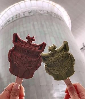 The Sanxingdui Museum in Southwest China’s Sichuan province, home to ancient relics unearthed from the Sanxingdui Ruins site, has recently rolled out two ice popsicles shaped like the bronze face masks excavated from the sacrificial pits of the site. The ice treats are flavored with "bronze" matcha and "excavation" chocolate, and are proving very popular among summer visitors.