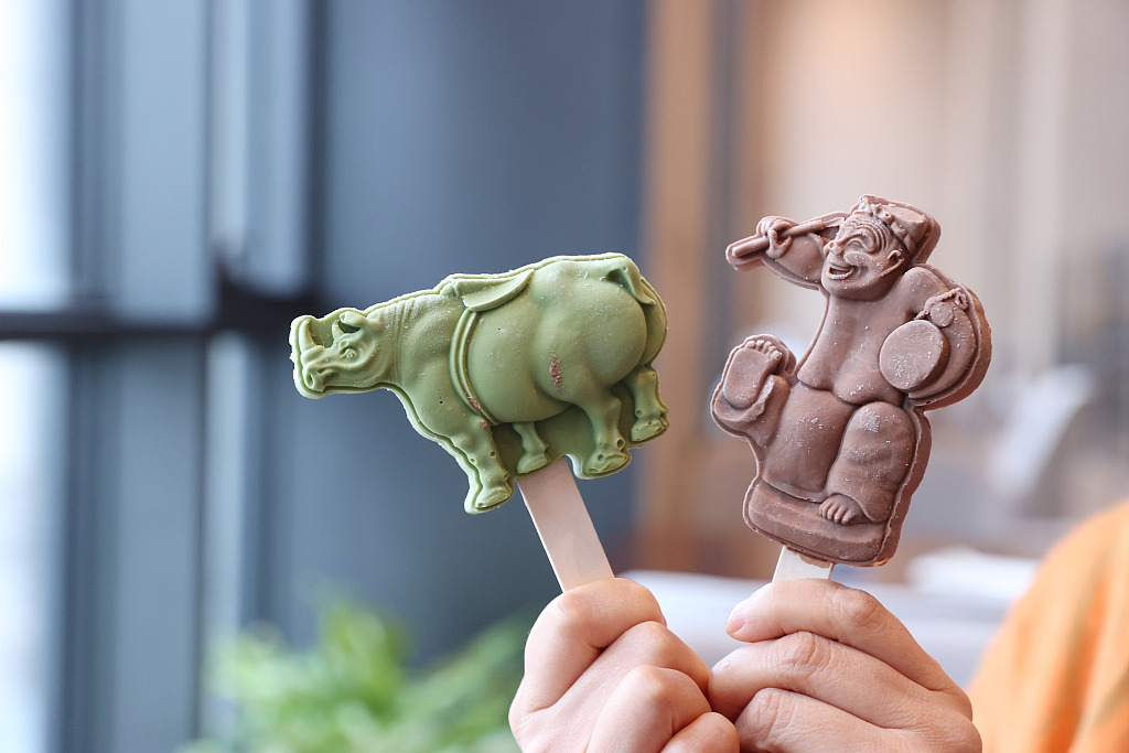 In the ice cream bar of the National Museum of China in Beijing, there are two “cultural relic ice pops”! They were vividly modeled after artifacts from the museum's collection: a tomb figurine of a storyteller and a bronze rhinoceros 'zun' vessel decorated with cloud patterns. Flavored with matcha and chocolate, the ice pops give visitors a deep impression of the cultural relics of the Han Dynasty (206 BC-AD 220).