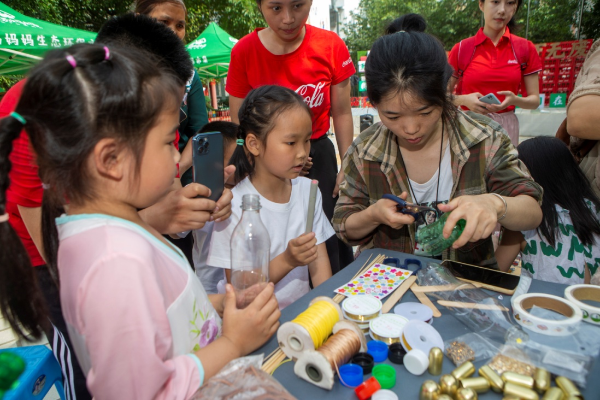 Volunteers and community residents have made artwork with recycled plastic bottles, which will be displayed in the community. Residents in Chengdu are also encouraged to earn beverages from Coca-Cola brands by turning in used drink bottles at designated sites.