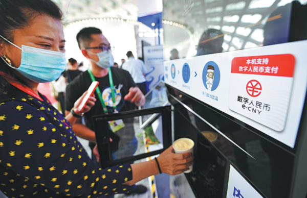 A visitor uses e-currency to buy a cup of coffee at the first China International Consumer Products Expo in Haikou, Hainan province, last month. GUO CHENG/XINHUA
