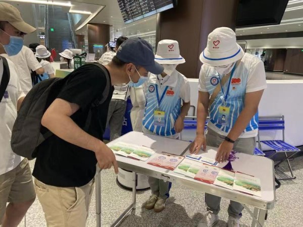 At the terminal building of Beijing Daxing International Airport, volunteers from the Capital Normal University provide information, guidance, check-in assistance and other services to passengers. They also give out brochures containing details about traditional Chinese festivals.