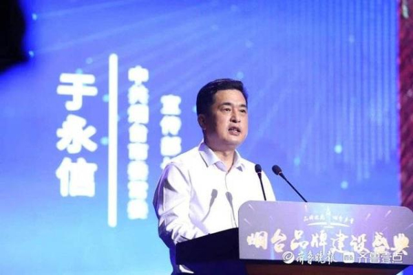 Yu Yongxin, director of the Publicity Department of the CPC Yantai Municipal Committee, delivers a keynote speech at the brand awarding conference on June 19. [Photo/qlwb.com]