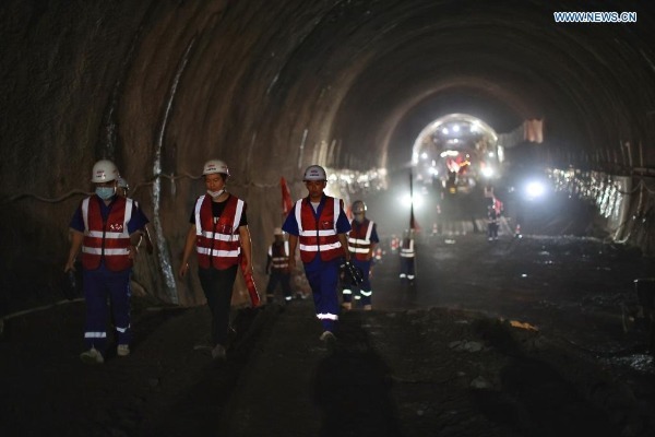 Staff members work inside the Yanjiazhai tunnel of the Guiyang-Nanning high-speed railway in Dushan county, Southwest China's Guizhou province, June 14, 2021. [Photo/Xinhua]