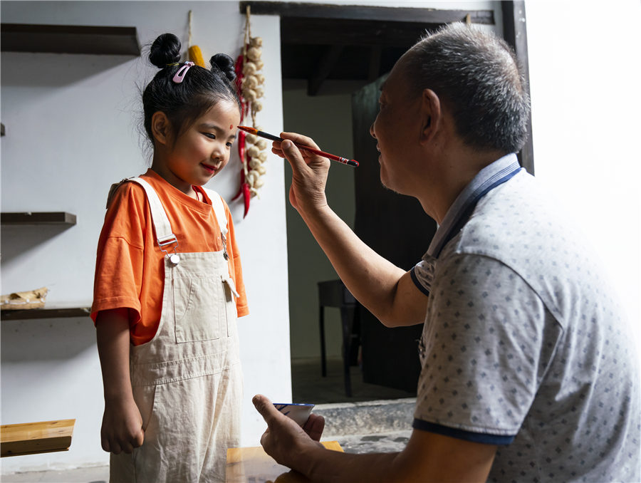 Realgar wine is applied on a child's head, which features a custom of the Dragon Boat Festival. [Photo provided to Chinaculture.org]