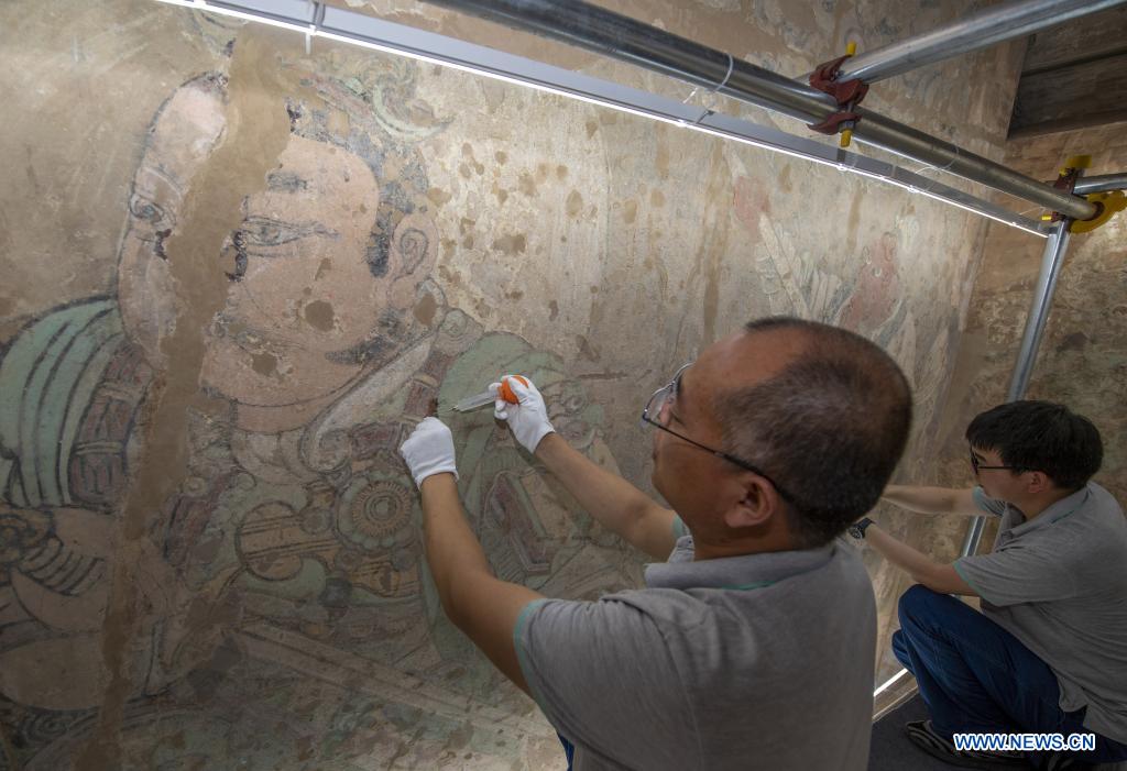 Cultural relics experts restore a mural at the Yongle Palace in Ruicheng county of Yuncheng, North China's Shanxi province, June 21, 2021. The restoration of Yuan Dynasty (1271-1368) murals in Yongle Palace, the largest Taoist temple in China, has started, said the Yongle Palace mural art museum. The restoration works this time will focus on the murals in the dragon and tiger hall (longhu hall) and double ninth hall (chongyang hall), comprising a damaged mural area of 195 square meters and 353 square meters, respectively. The restoration of the murals in the two halls is expected to take two years, according to Xi Jiulong, head of the Yongle Palace mural preservation research institute. [Photo/Xinhua]