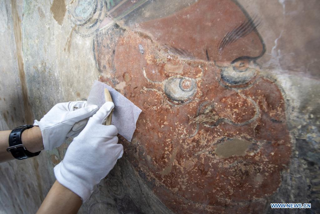 A cultural relics expert restores a mural at the Yongle Palace in Ruicheng county of Yuncheng, North China's Shanxi province, June 21, 2021. The restoration of Yuan Dynasty (1271-1368) murals in Yongle Palace, the largest Taoist temple in China, has started, said the Yongle Palace mural art museum. The restoration works this time will focus on the murals in the dragon and tiger hall (longhu hall) and double ninth hall (chongyang hall), comprising a damaged mural area of 195 square meters and 353 square meters, respectively. The restoration of the murals in the two halls is expected to take two years, according to Xi Jiulong, head of the Yongle Palace mural preservation research institute. [Photo/Xinhua]