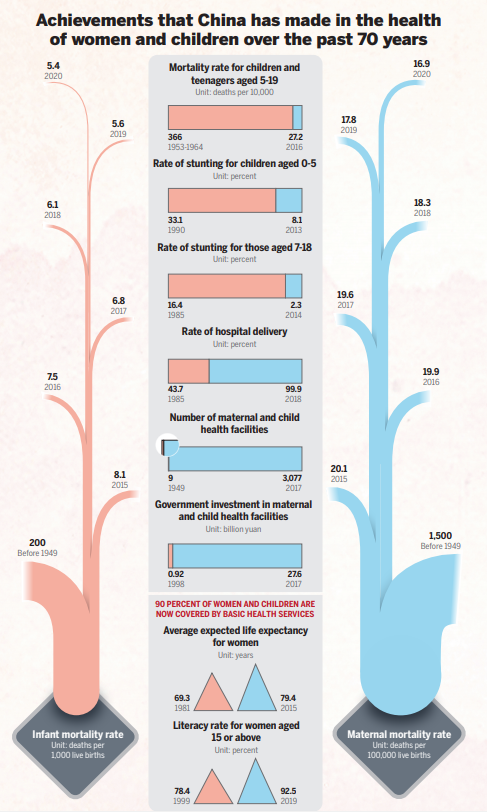 "The health of women and children is a significant marker of the development of society," she said. "In 2020, the national maternal mortality rate was 16.9 per 100,000, down by 15.9 percent from 2015. The infant mortality rate stood at 5.4 per 1,000 in 2020, a decrease of 33.3 percent compared with 2015."
