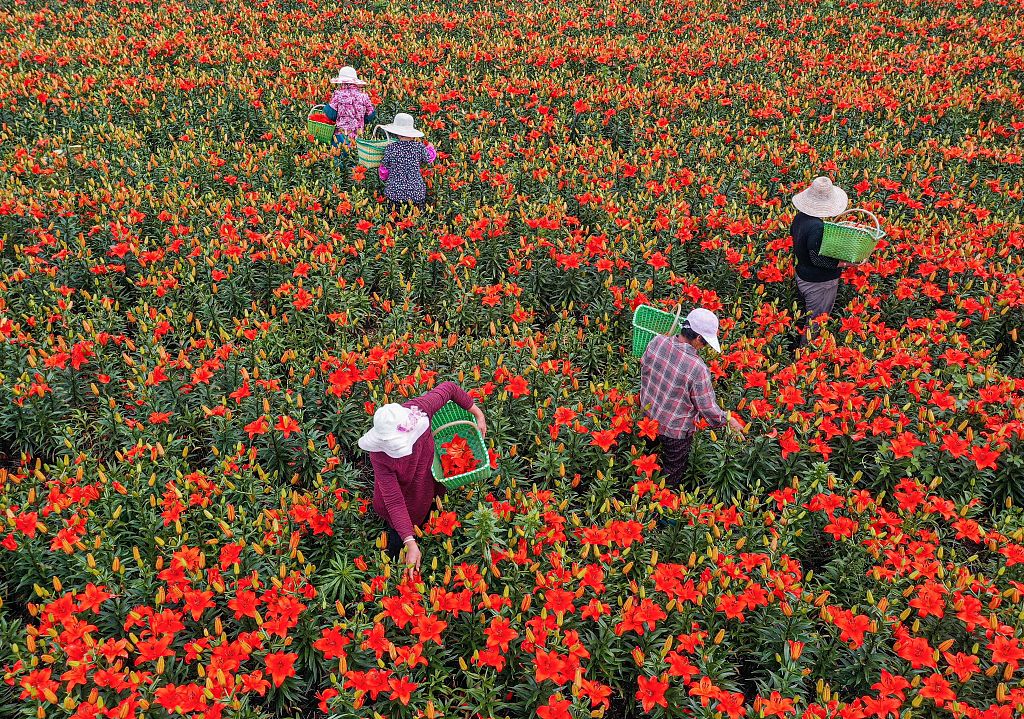 Farmers were photographed collecting lilies at a plantation in Rongcheng, Weihai, East China's Shandong province, on June 18, as the flowers are currently in full blossom. [Photo/VCG]