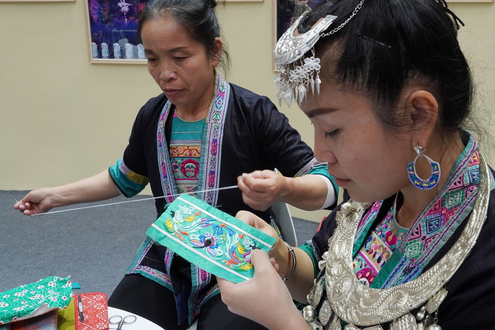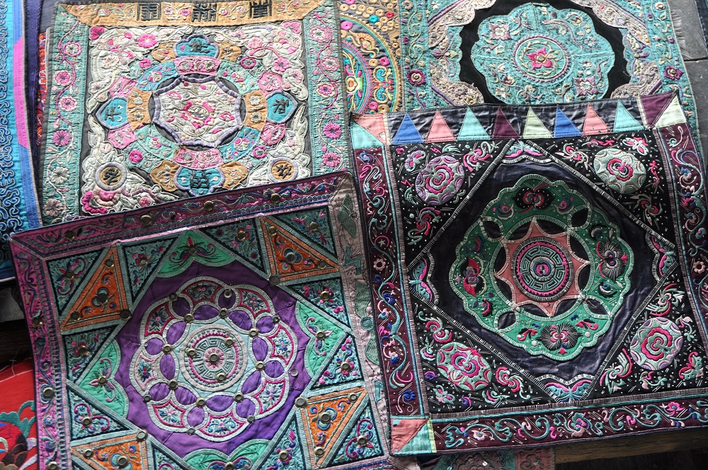 The embroidery of the Dong ethnic group, which primarily depicts flowers and geometric patterns, is widely employed across headscarves, shoes, bags, pouches and ornamental garments. Its techniques include a rich variety of stitching types, such as flat, crossed and knotted stitches.