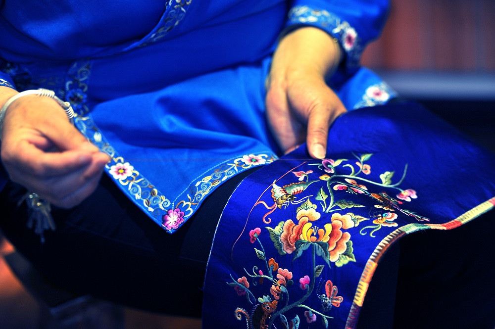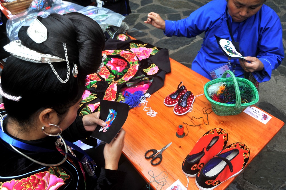 Embroidery of the Miao ethnic group is characterized by extraordinary skills, ingenious designs, rich imagination, strong color contrasts and rustic styles. Featuring a variety of pattern designs, the Miao people living in the Songtao region of Guizhou province love embroidering flowers, birds, insects and fish with pink, blue or velvet threads; those in the Qiandongnan area prefer dragons, fish, butterflies and pomegranates; while those in the central areas of the province excel in geometric patterns in red, green and laundry blue.