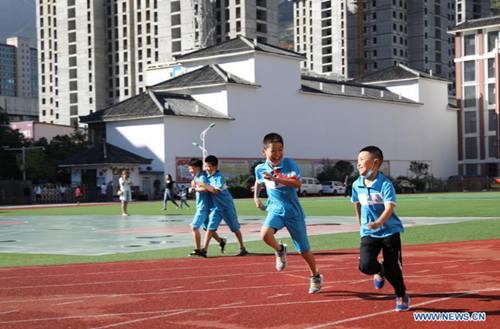 Pupils run on the playground at a primary school in Longnan city, Northwest China's Gansu province, on Aug 31, 2020. [Photo/Xinhua]