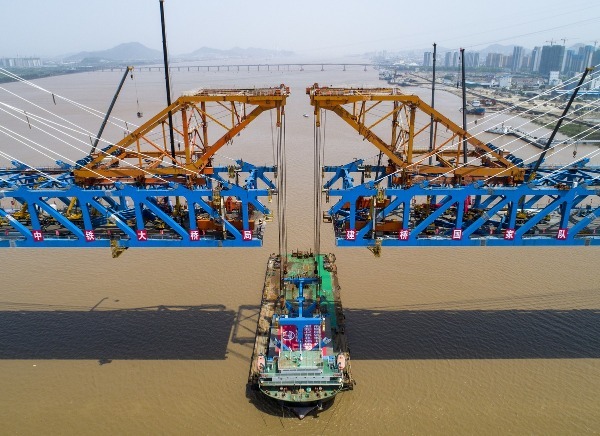 The last piece of steel beam is hoisted at the construction site of the Jiaojiang grand bridge, a key project of the Hangzhou-Shaoxing-Taizhou inter-city railway, in East China's Zhejiang province, on April 17, 2021. [Photo/Xinhua]