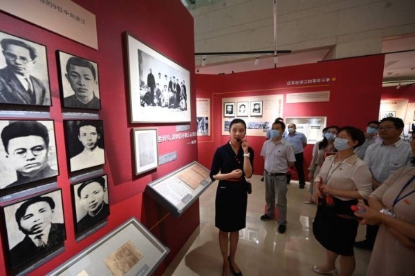 A tour guide gives a presentation about CPC revolutionaries to visitors of the exhibition. [Photo/zj.zjol.com.cn]