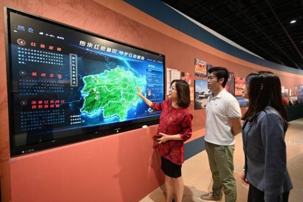 Visitors interact with an electronic touch screen at the exhibition to learn about red tourism destination in Zhejiang province. [Photo/zj.zjol.com.cn]