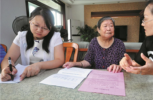 Ma Maojie talks with community workers in Hefei, Anhui province. AN JUN/CHINA NEWS SERVICE