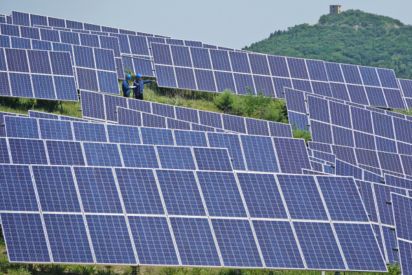 Workers inspect photovoltaic equipment at a photovoltaic power station in Huili Town, Fushan district, Yantai, East China's Shandong province on June 21. [Photo/VCG]
