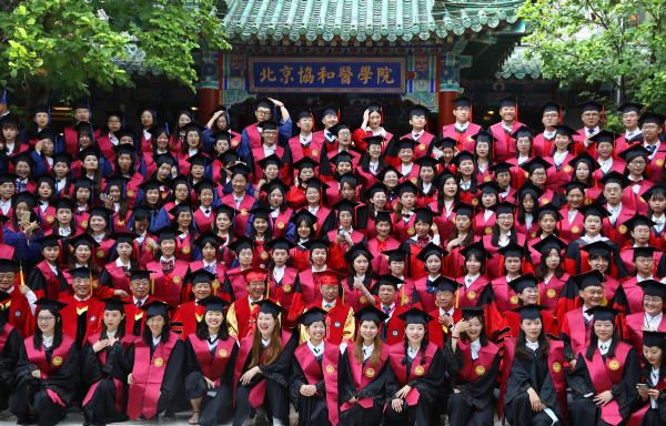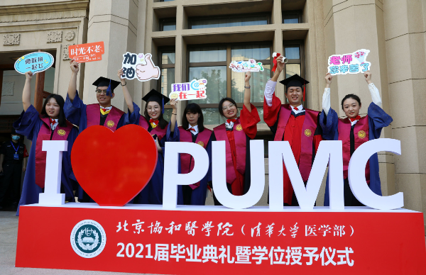 Wang Chen, center, president of Peking Union Medical College, takes a group photo with graduates on July 3, 2021. There are 1,548 graduates at the college in Beijing this year. [Photo by Zhu Xingxin/chinadaily.com.cn]