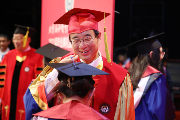 Wang Chen, president of Peking Union Medical College, turns the tassel for a graduate at a graduation ceremony in Beijing on July 4, 2021. [Photo by Zhu Xingxin/chinadaily.com.cn]