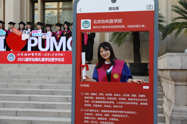 Graduates take selfies with Wang Chen (center), president of Peking Union Medical College, on July 3, 2021, when graduates take group photos before a graduation ceremony to be held in Beijing on July 4. [Photo by Zhu Xingxin/chinadaily.com.cn]