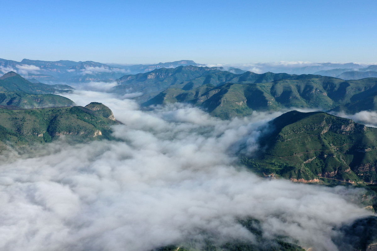 Aerial photo taken on July 3, 2021, shows a sea of clouds at Tianhe Mountain scenic spot in Xingtai city, North China's Hebei province. Cloud and mist float amid the lush greenery, unveiling a picturesque landscape. [Photo/Xinhua]