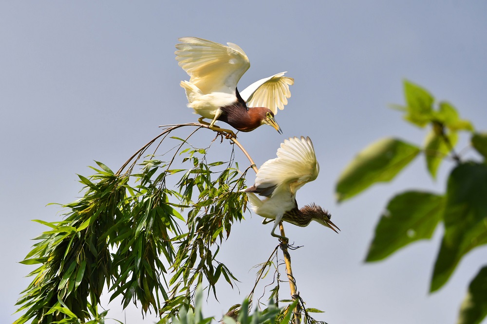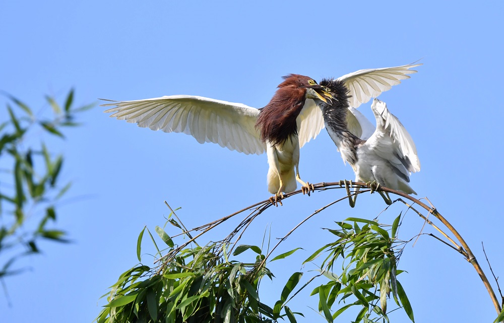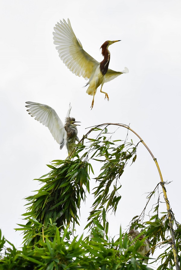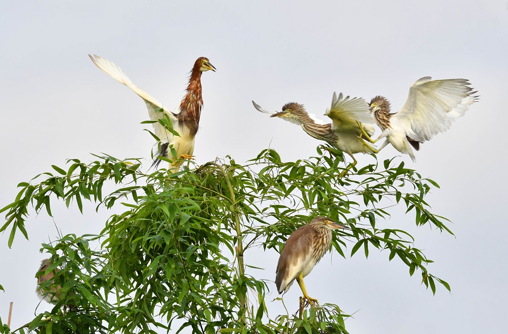 A couple of Chinese pond herons enjoy quality time with their chicks in a bamboo forest, creating a lively summer scene in Qiannan Bouyei and Miao autonomous prefecture, Guizhou province.
