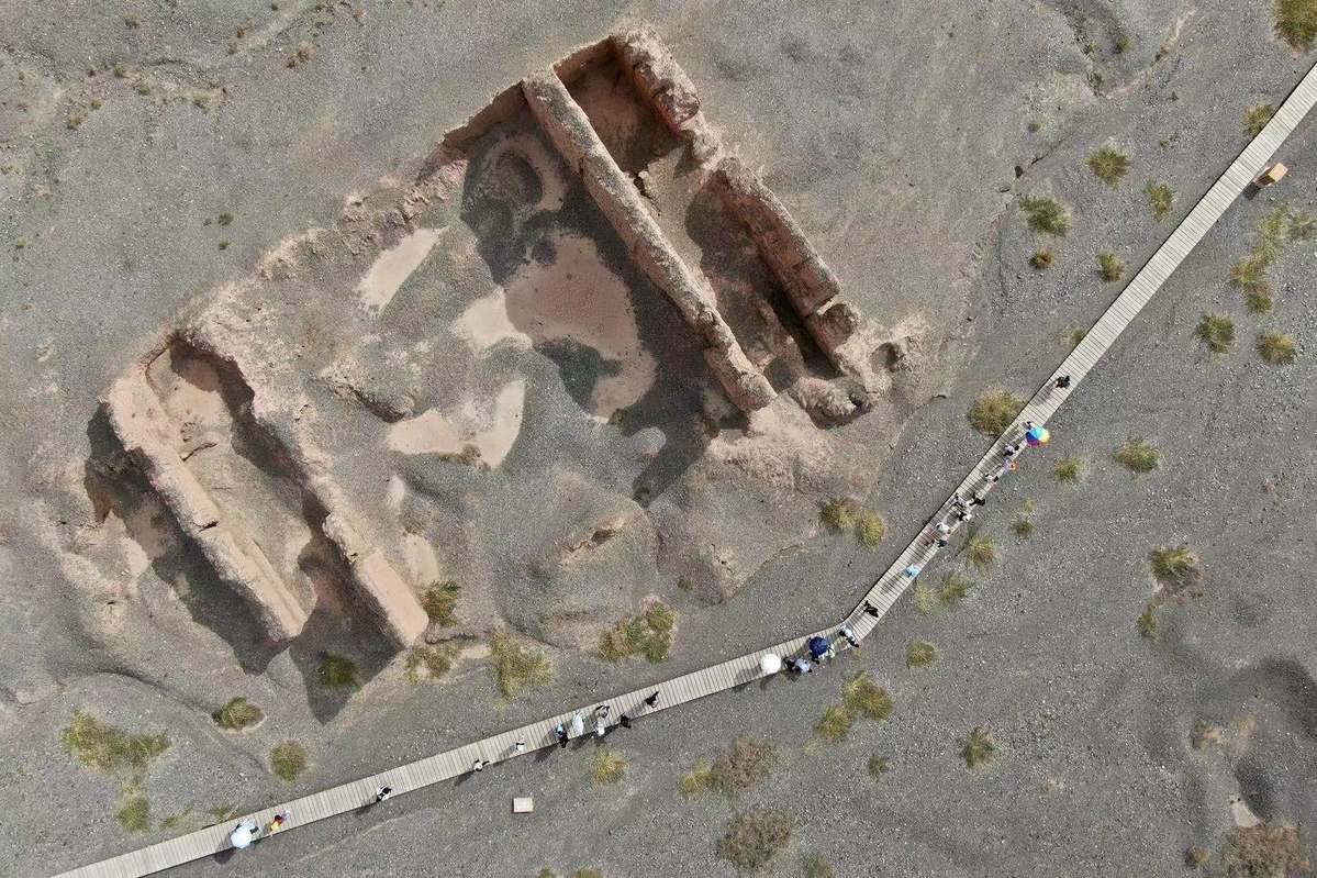 An aerial photo shows the Subashi Buddhist Temple Ruins along the Duku Highway, on July 11, 2021. [Photo by Wei Xiaohao/chinadaily.com.cn]