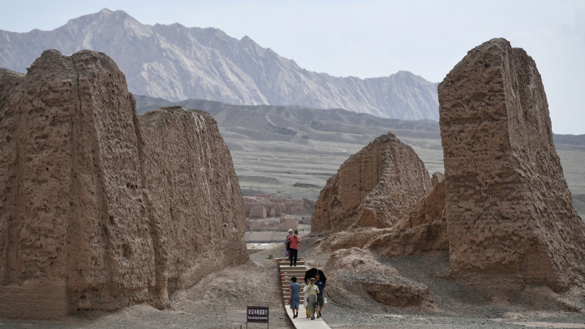 Tourists visit the Subashi Buddhist Temple Ruins along the Duku Highway, on July 11, 2021. [Photo by Wei Xiaohao/chinadaily.com.cn]