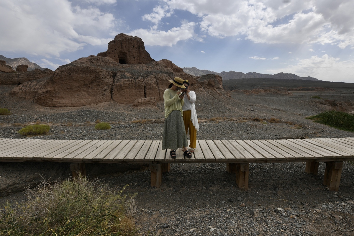 Two tourists visit the Subashi Buddhist Temple Ruins along the Duku Highway, on July 11, 2021. [Photo by Wei Xiaohao/chinadaily.com.cn]